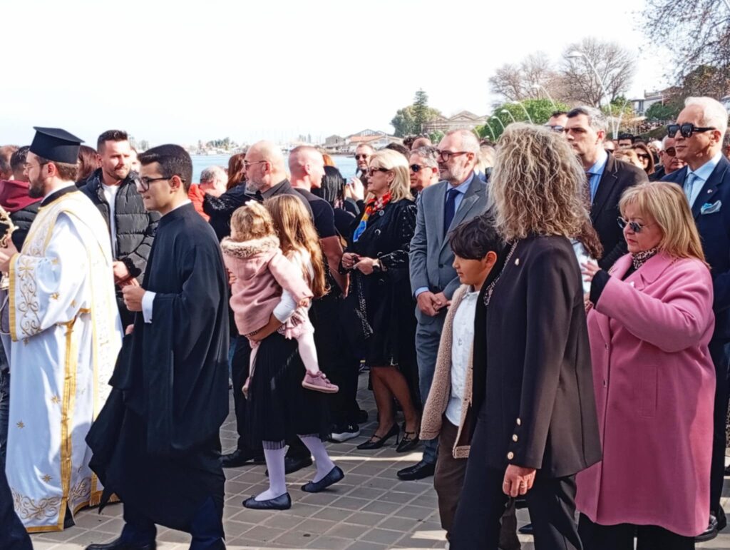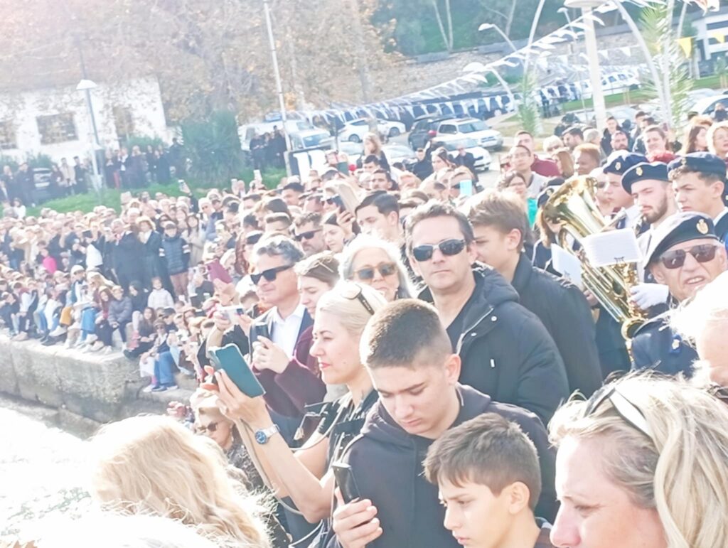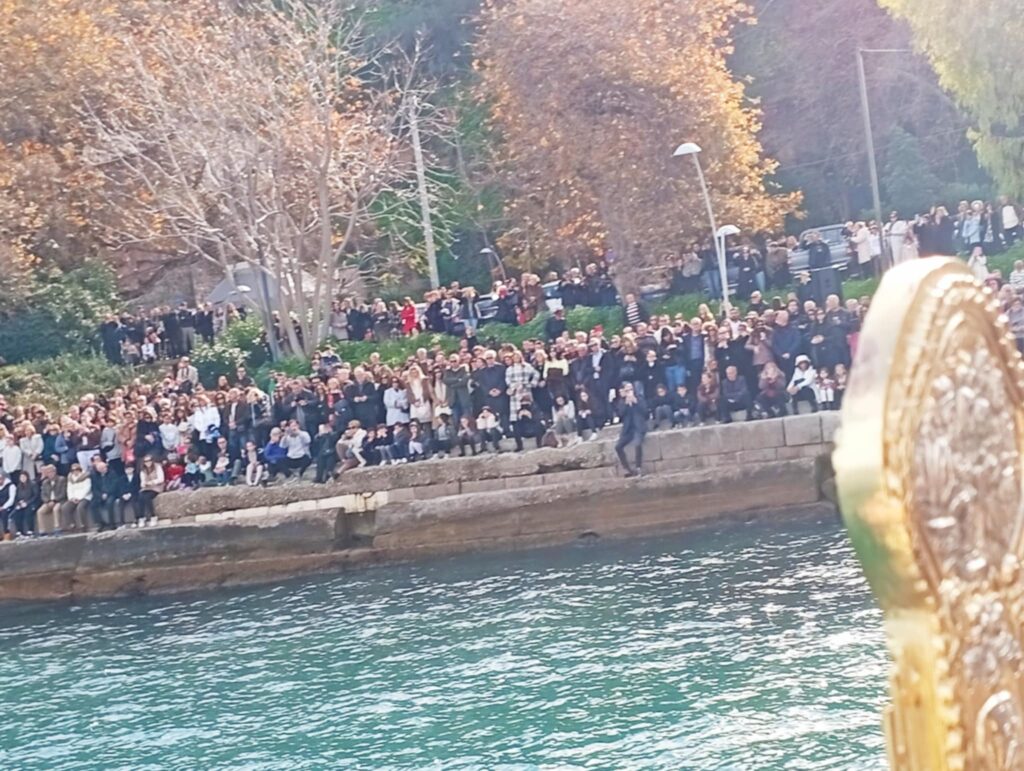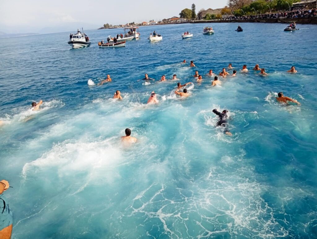 Υπό το βλέμμα εκατοντάδων πιστών που είχαν γεμίσει απ’ άκρη σ’ άκρη τη λιμενική ζώνη αλλά και με νεαρούς τολμηρούς που βούτηξαν για να πιάσουν τον Σταυρό.