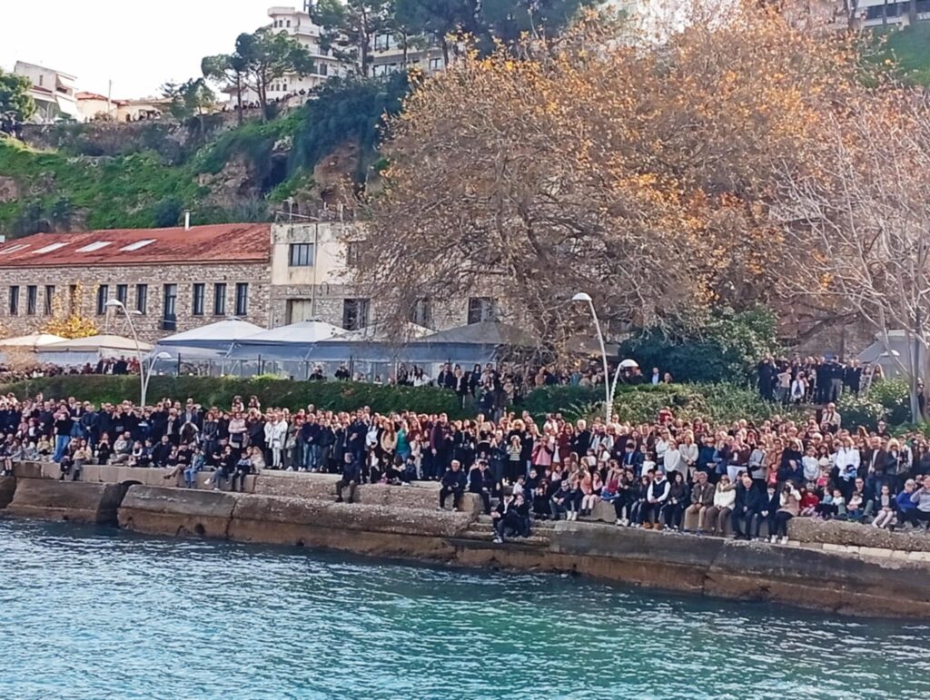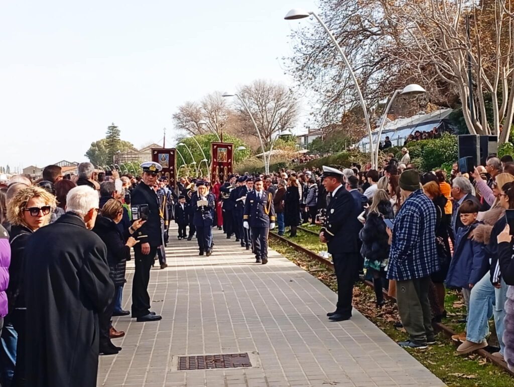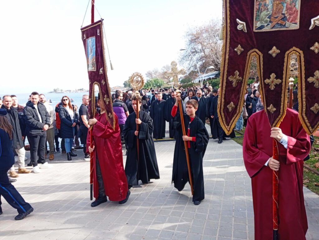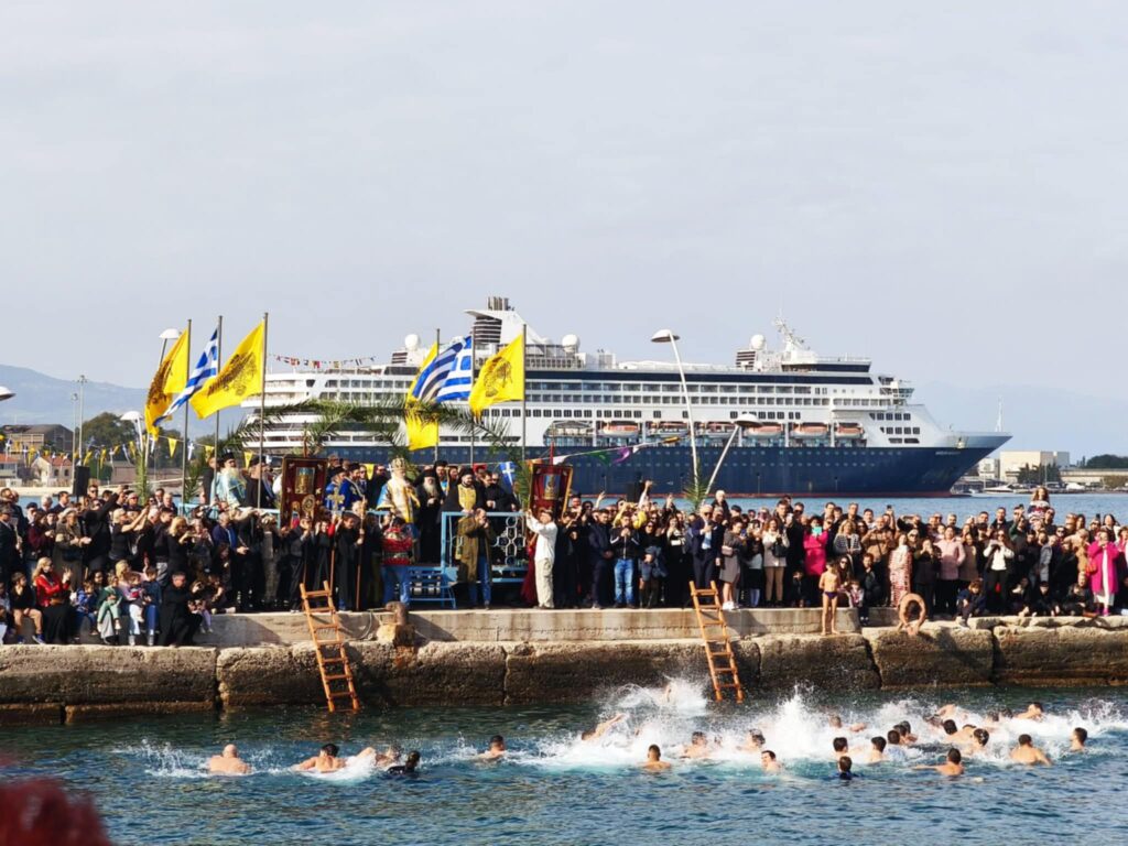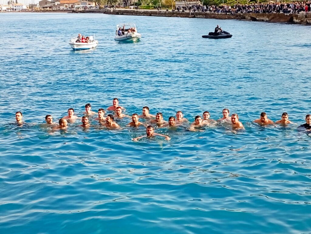 Υπό το βλέμμα εκατοντάδων πιστών που είχαν γεμίσει απ’ άκρη σ’ άκρη τη λιμενική ζώνη αλλά και με νεαρούς τολμηρούς που βούτηξαν για να πιάσουν τον Σταυρό.