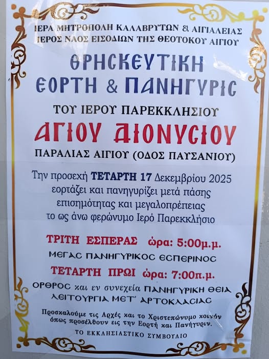 Με θρησκευτική κατάνυξη και λαμπρότητα θα εορταστεί την Τετάρτη 17 Δεκεμβρίου 2025 η μνήμη του Αγίου Διονυσίου, στον ομώνυμο Ιερό Παρεκκλήσιο που βρίσκεται στην Παραλία Αιγίου (οδός Παυσανίου), στο πλαίσιο της καθιερωμένης πανηγύρεως.