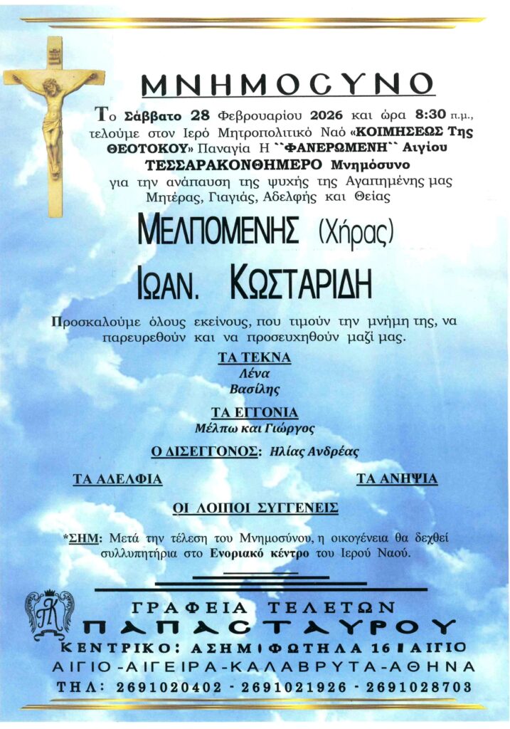ΑΙΓΙΟ: Το Σάββατο το μνημόσυνο της Μελπομένης Κωσταρίδη