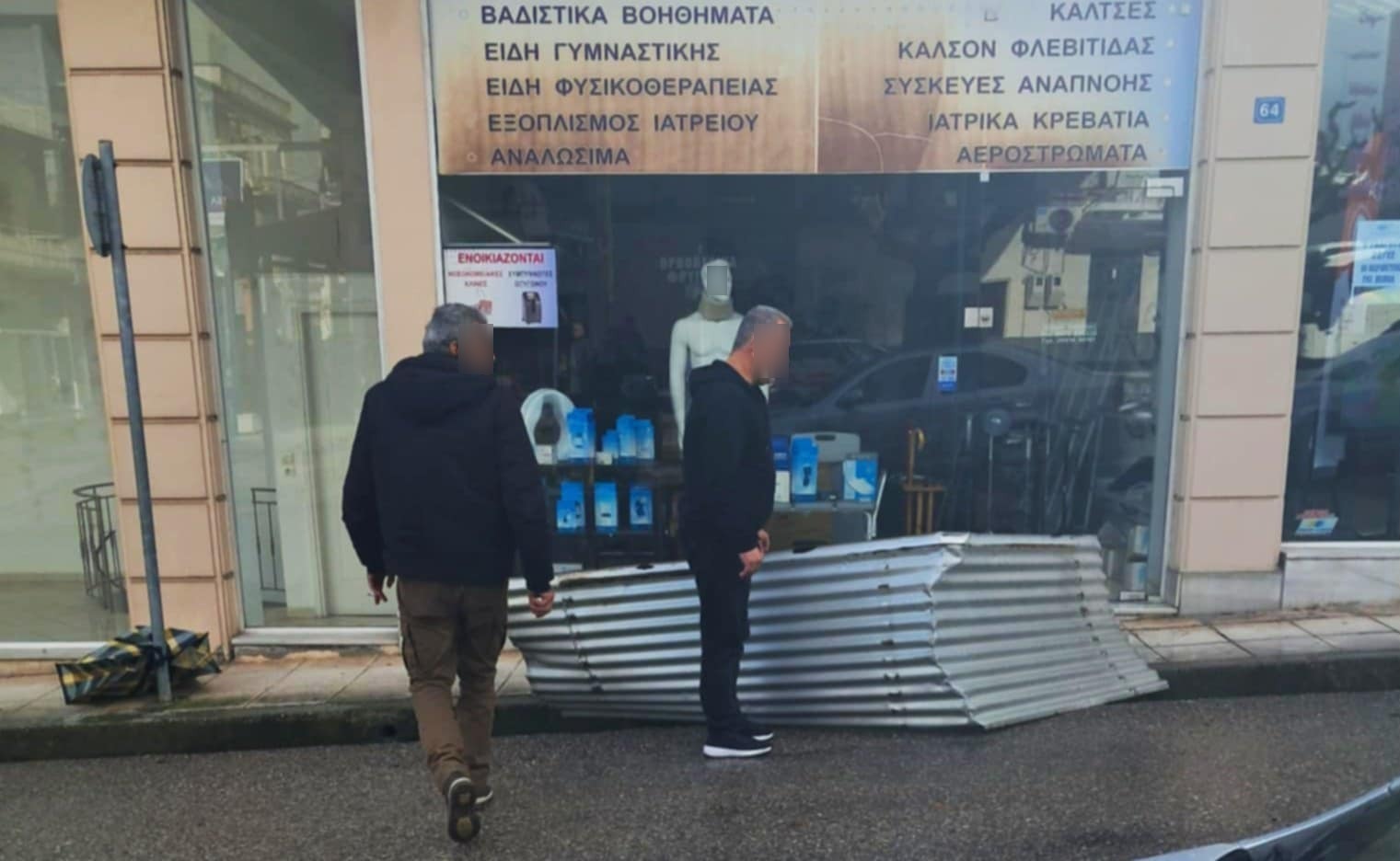 Σύμφωνα με τις πρώτες πληροφορίες, ο τσίγκος αποκολλήθηκε λόγω των ισχυρών ανέμων και κατέληξε στο οδόστρωμα δίπλα σε σταθμευμένο ταξί, προκαλώντας έντονη ανησυχία στους διερχόμενους πολίτες. Επαγγελματίες της περιοχής έσπευσαν άμεσα και μετέφεραν τον τσίγκο στην άκρη του δρόμου, προκειμένου να αποφευχθεί κάποιο ατύχημα.