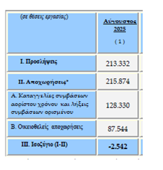 Πιο συγκεκριμένα, τον Αύγουστο 2025, οι προσλήψεις ανήλθαν σε 213.332 ενώ οι απολύσεις σε 215.874, δηλαδή είχαμε 2.542 περισσότερες απολύσεις από προσλήψεις. Το στοιχείο αυτό δύσκολα μπορεί να ερμηνευθεί αφού ο Αύγουστος είναι μήνας που δεν δικαιολογεί απολύσεις και οι επιχειρήσεις (κυρίως του τουρισμού και της εστίασης) δηλώνουν καθημερινά ότι έχουν έλλειψη προσωπικού.
