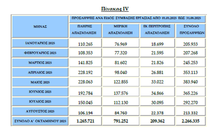 Πιο συγκεκριμένα, τον Αύγουστο 2025, σε σύνολο 213.332 νεοπροσληφθέντων εργαζομένων, 106.194 άτομα προσλήφθηκαν για πλήρη απασχόληση (ποσοστό 49,7%), ενώ 107.138 (84.790+22.378) άνθρωποι (ποσοστό 50,3%) παρέχουν μερική απασχόληση ή εκ περιτροπής.