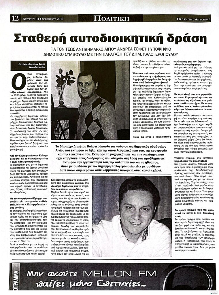 Η μεγαλύτερη αντίφαση, όμως, προκύπτει από τα ίδια του τα λόγια, σε παλαιότερη συνέντευξή του (εφημ. ΠΡΩΤΗ ΤΗΣ ΑΙΓΙΑΛΕΙΑΣ, 11/10/2011). Ερωτηθείς τότε για τη σχέση κομμάτων και τοπικής κοινωνίας, είχε δηλώσει με έμφαση: «Δεν θα ήταν λοιπόν το λογικό να επιβάλει ένα κόμμα την επιλογή του νέου Δημάρχου Αιγιαλείας και να στηρίξει την επιλογή μιας τοπικής κοινωνίας; […] Τα κομματικά συμφέροντα ενίοτε δεν ταυτίζονται απόλυτα με τα συμφέροντα ενός τόπου».