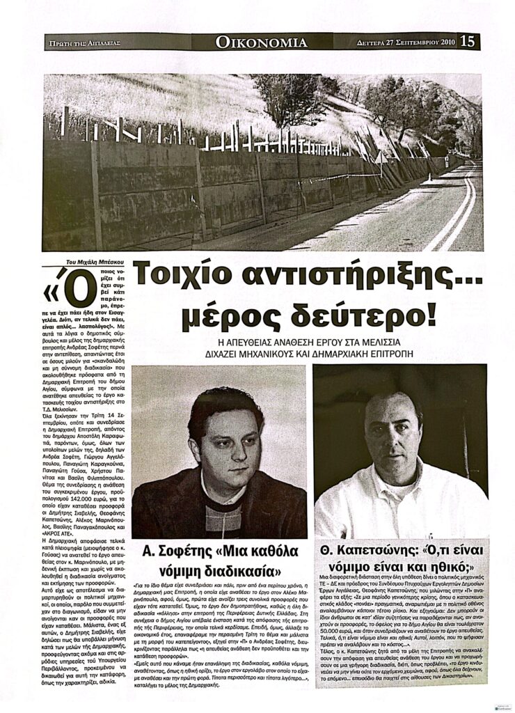 Πέραν των παραπάνω, το όνομα του κ. Σοφέτη είχε εμπλακεί και στην πολυσυζητημένη υπόθεση του «τοιχίου αντιστήριξης» στα Μελίσσια, ένα έργο που προκάλεσε σφοδρές πολιτικές αντιδράσεις και έφτασε μέχρι τις δικαστικές αίθουσες. Όπως αναφέρεται σε σχετικό δημοσίευμα (εφημ. ΠΡΩΤΗ ΤΗΣ ΑΙΓΙΑΛΕΙΑΣ, 27/09/2011), ο κ. Σοφέτης ήταν μεταξύ των δημοτικών συμβούλων που υπερψήφισαν την ανάθεση του έργου. Η υπόθεση αφορούσε, μεταξύ άλλων, και μαρτυρίες πολιτικών μηχανικών για «κατηγορίες που αφορούσαν, εάν στο διαγωνισμό, είχαν γίνει μηχανορραφίες». Η εμπλοκή του ονόματός του σε μια τόσο αμφιλεγόμενη υπόθεση, προσθέτει ένα ακόμη «βάρος» του παρελθόντος στο προφίλ του υποψηφίου.