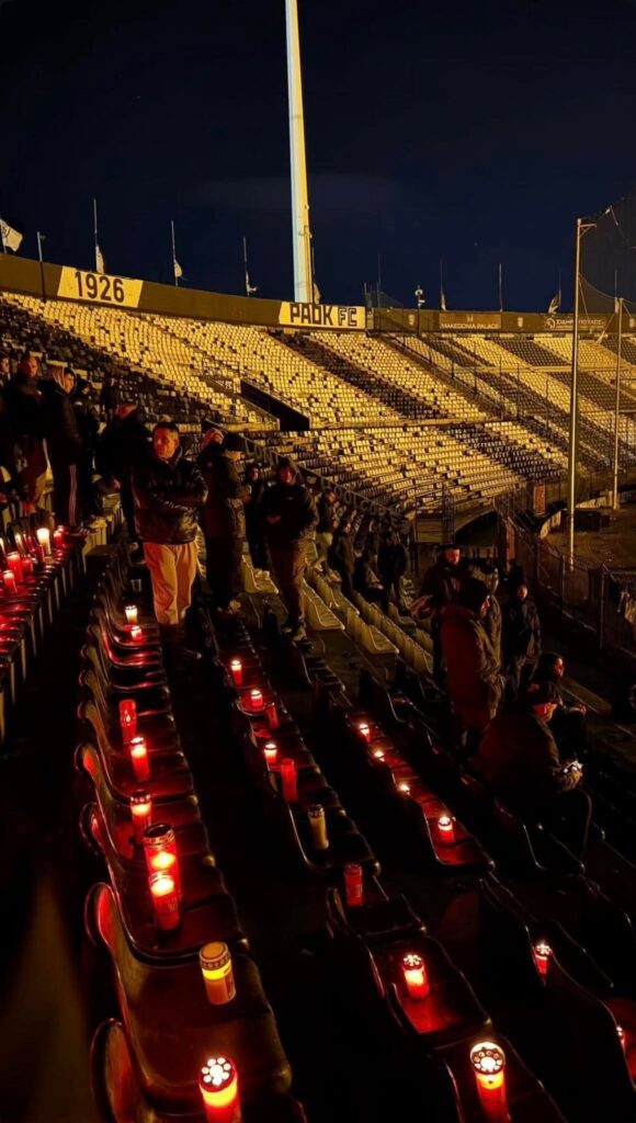 Άναψαν κεριά, άπλωσαν πανό που έλεγε «Καλό Παράδεισο Αδέρφια» για να τιμήσουν τους αδικοχαμένους νέους, που για την αγαπημένη τους ομάδα έχασαν τη ζωή τους το μεσημέρι της Τρίτης (27/01).