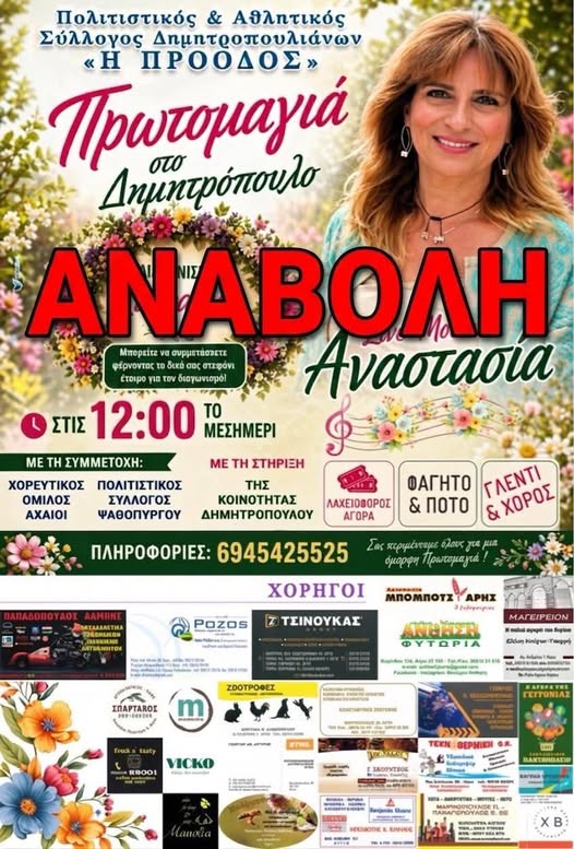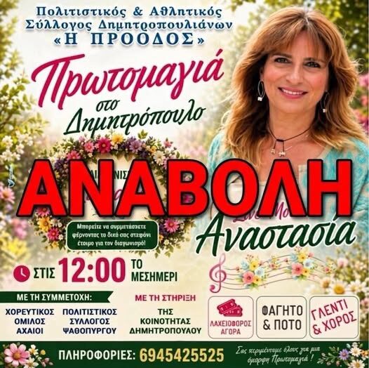 Την αναβολή της προγραμματισμένης εκδήλωσης για την Πρωτομαγιά ανακοίνωσε το Διοικητικό Συμβούλιο του Πολιτιστικού & Αθλητικού Συλλόγου Δημητρόπουλου «Η Πρόοδος», εξαιτίας των δυσμενών καιρικών συνθηκών που προβλέπονται για την περιοχή.