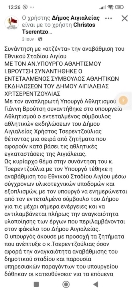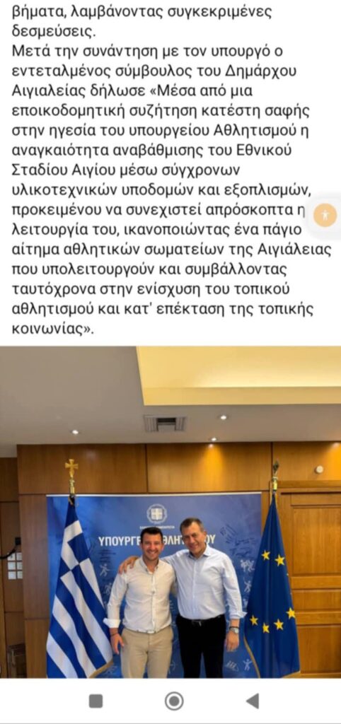 Παρόλα αυτά ο Δήμαρχος Αιγιαλείας επέλεξε να πάει στο υπουργείο για να συναντηθεί με τον Διευθυντή του υπουργικού γραφείου και συνοδευόμενος μάλιστα από τον Αντιδήμαρχο Πολιτισμού-Αθλητισμού- Διαχείρισης Αδέσποτων Ζώων κ. Γιώργο Φραγκονικολόπουλο και τον άμισθο ειδικό σύμβουλό του σε θέματα αθλητικών υποδομών κ. Πέτρο Δαδιώτη.