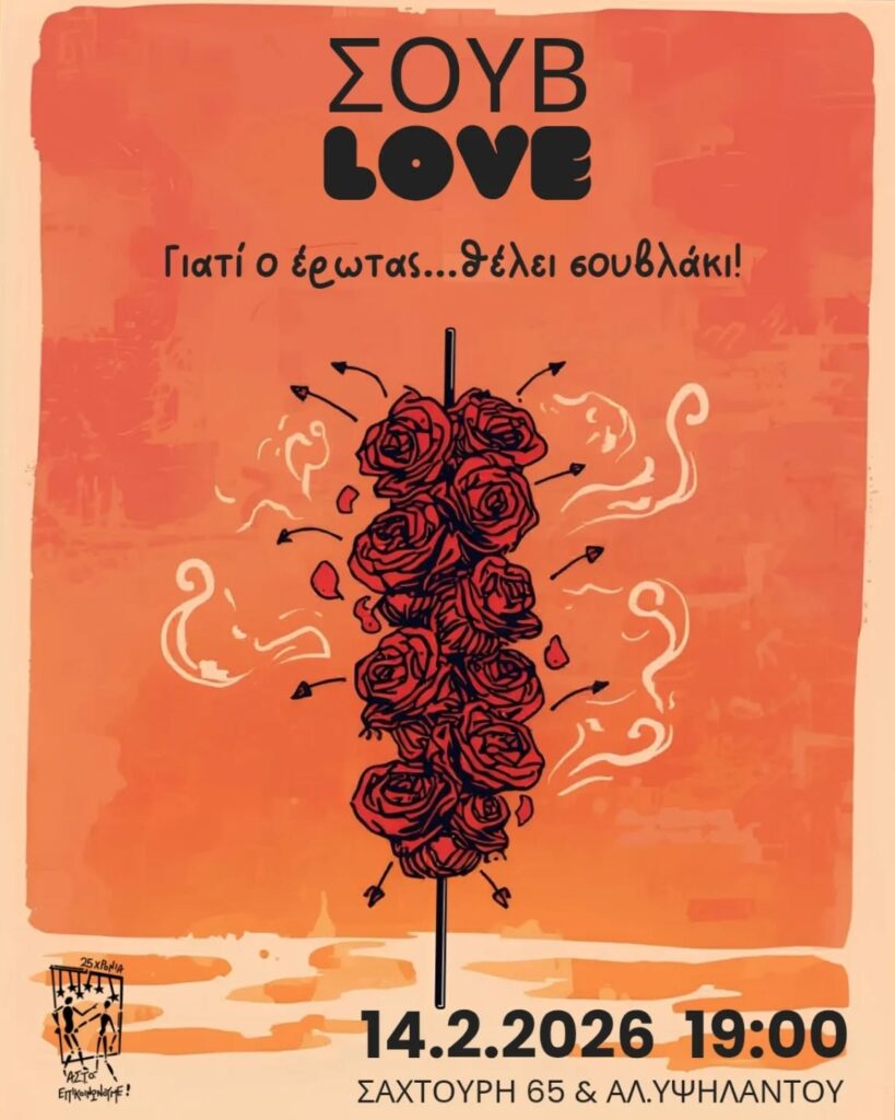 Στην Πάτρα ανήμερα τη γιορτή των ερωτευμένων, ο Αντιεφησυχαστικός Σύλλογος Τωρινών Ονειροπόλων – Επικοινωνούμε” διοργανώνει εκδήλωση – χορό, σε συνδυασμό με… γεμάτο στομάχι! Και μάλιστα, γεμάτο από σουβλάκια…