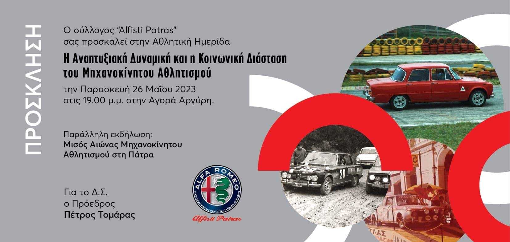 Αθλητική ημερίδα για την αναπτυξιακή δυναμική και την κοινωνική διάσταση που προσφέρει ο μηχανοκίνητος αθλητισμός, διοργανώνει ο Σύλλογος «ALFISTI Πάτρας» με την υποστήριξη της Περιφέρειας Δυτικής Ελλάδας, την Παρασκευή 26 Μαΐου 2023, στις 19:00, στην Αγορά Αργύρη.