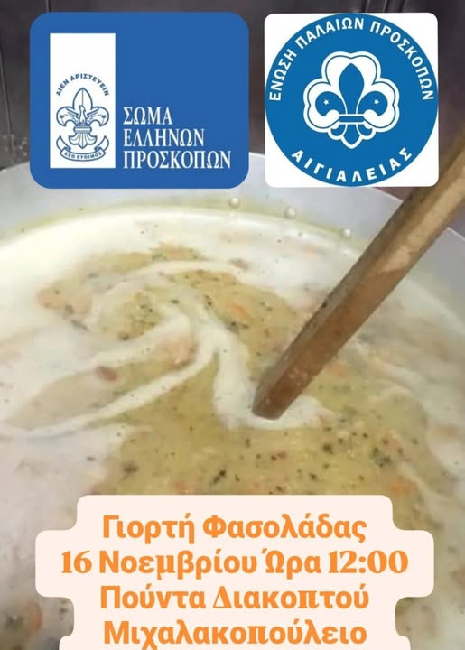 Η Ένωση Παλαιών Προσκόπων Αιγιαλείας προσκαλεί το κοινό στην καθιερωμένη ετήσια γιορτή «Φασολάδα», η οποία θα πραγματοποιηθεί αύριο, Κυριακή 16 Νοεμβρίου, στις 12:00 το μεσημέρι. Η εκδήλωση θα φιλοξενηθεί στις εγκαταστάσεις του Μιχαλακοπούλειου Κληροδοτήματος του Δήμου Αιγιαλείας, στην Πούντα της Κοινότητας Διακοπτού.