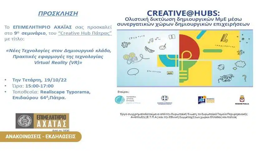 Το Επιμελητήριο Αχαΐας σας προσκαλεί στο 9ο βιωματικό σεμινάριο του Creative@Hub Πάτρας με τίτλο «Νέες Τεχνολογίες στον Δημιουργικό κλάδο, Πρακτικές εφαρμογές της τεχνολογίας Virtual Reality (VR)» που θα πραγματοποιηθεί την Τετάρτη 19 Οκτωβρίου και ώρα 15:00-17:00 στο Realiscape Typorama,Επιδαύρου 64 Α ,Πάτρα.