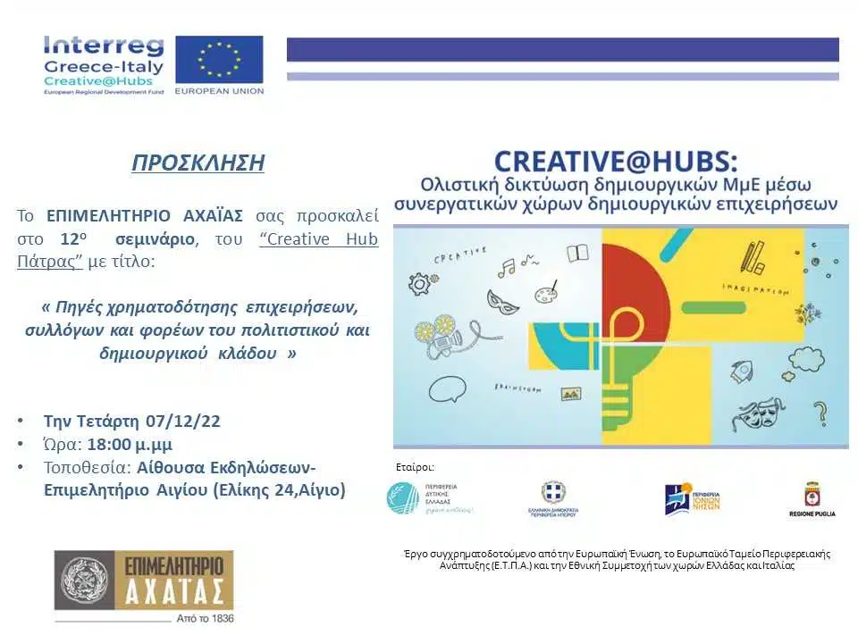 Το 12ο σεμινάριο με τίτλο «Πηγές χρηματοδότησης επιχειρήσεων, συλλόγων και φορέων του πολιτιστικού και δημιουργικού κλάδου» θα πραγματοποιηθεί την Τετάρτη 7 Δεκεμβρίου στις 18:00 στην αίθουσα του Επιμελητηρίου Αιγίου (Ελίκης 24, Αίγιο).