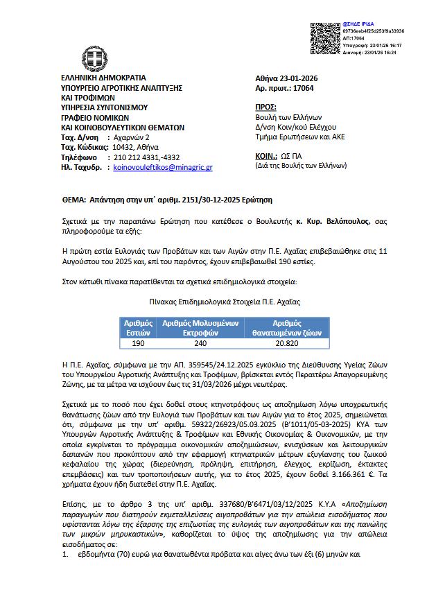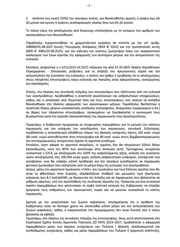 Παραδέχεται επίσης ότι δεν υπάρχει ακόμη πρόγραμμα ανασύστασης ζωικού κεφαλαίου και ότι οι περιορισμοί παρατείνονται τουλάχιστον έως 31/03/2026.