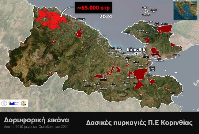 Η πρόσφατη δασική φωτιά στην Κορινθία επηρέασε περίπου 65.000 στρέμματα μέχρι και το πρωί της Τρίτης 1 Οκτωβρίου 2024.
