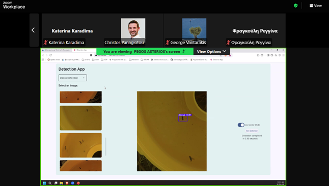 Σκοπός της συνάντησης ήταν η παρουσίαση και αναλυτική ενημέρωση σχετικά με το πιλοτικό σύστημα αναγνώρισης του Δάκου του εντόμου που προσβάλλει τις ελαιοκαλλιέργειες, καθώς και το λογισμικό και η εγκατάσταση που αναπτύσσονται στο πλαίσιο του έργου Ambitious. Οι συμμετέχοντες ενημερώθηκαν διεξοδικά για τη λειτουργία του εργαλείου, τα μέχρι στιγμής αποτελέσματα και τις τεχνικές παραμέτρους εφαρμογής του στο πεδίο.