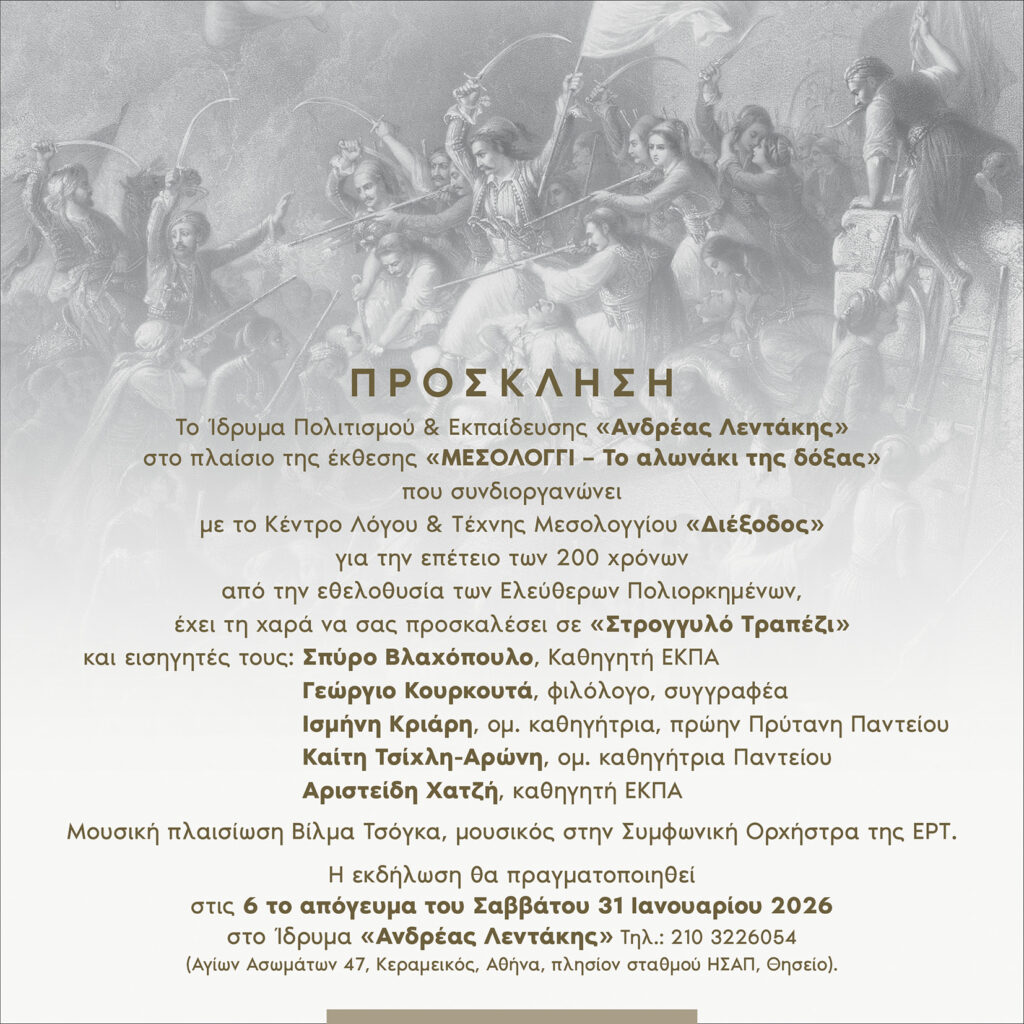 Ένα πάνελ υψηλού κύρους συγκεντρώνεται στο Ίδρυμα «Ανδρέας Λεντάκης» για να ρίξει φως στις ιστορικές πτυχές της Εξόδου του Μεσολογγίου. Στο πλαίσιο της επετειακής έκθεσης για τα 200 χρόνια από την ιστορική Έξοδο, καθηγητές του ΕΚΠΑ και του Παντείου Πανεπιστημίου, όπως ο Σπύρος Βλαχόπουλος, η Ισμήνη Κριάρη και ο Αριστείδης Χατζής, θα συμμετάσχουν σε μια δημόσια συζήτηση-στρογγυλό τραπέζι, πλαισιωμένη μουσικά από την Συμφωνική Ορχήστρα της ΕΡΤ, προσφέροντας μια σφαιρική προσέγγιση στο ιστορικό γεγονός που συγκλόνισε την Ευρώπη.