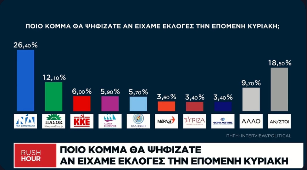 Στην πρόθεση ψήφου, η Νέα Δημοκρατία παραμένει στην πρώτη θέση, διατηρώντας μια διαφορά ασφαλείας, το ΠΑΣΟΚ στη δεύτερη θέση, ενώ ο ΣΥΡΙΖΑ συνεχίζει την ελεύθερη πτώση του.
