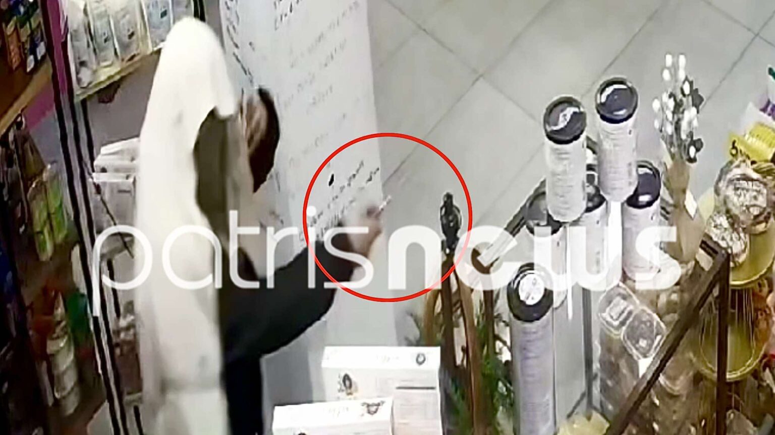 Στο υλικό από το κλειστό κύκλωμα, ο άνδρας φαίνεται να μπουκαρει στο κατάστημα με το κεφάλι του τυλιγμένο με μια… πετσέτα. Στο χέρι του κρατά ένα κατσαβίδι, με το οποίο -όπως φαίνεται καθαρά, πλησιάζει την υπάλληλο και την απειλεί.