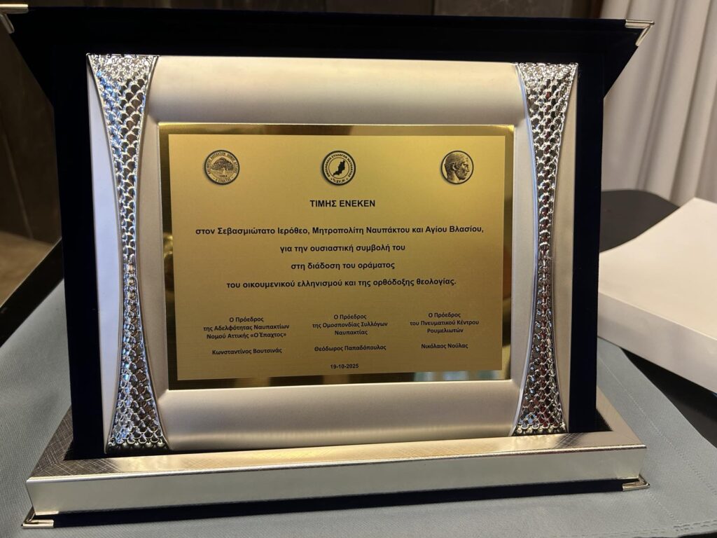 Την Κυριακή 19 Οκτωβρίου 2025, στην αίθουσα «Δελφοί» του Πνευματικού Κέντρου Ρουμελιωτών (ΠΚΡ), πραγματοποιήθηκε εκδήλωση, η οποία ήταν αφιερωμένη στον Μητροπολίτη Ναυπάκτου και Αγίου Βλασίου, κ.κ. Ιερόθεο, με αφορμή την επέτειο των 30 χρόνων της αρχιερατικής ποιμαντορίας του και τη συμβολή του στη διάδοση του οράματος του οικουμενικού ελληνισμού.