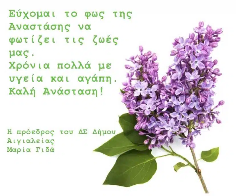 Εύχομαι το φως της Ανάστασης να φωτίζει τις ζωές μας. Χρόνια Πολλά με υγεία και αγάπη. Καλή Ανάσταση! εύχεται η Πρόεδρος του ΔΣ του Δήμου Αιγιαλείας Μαρία Γιδά.