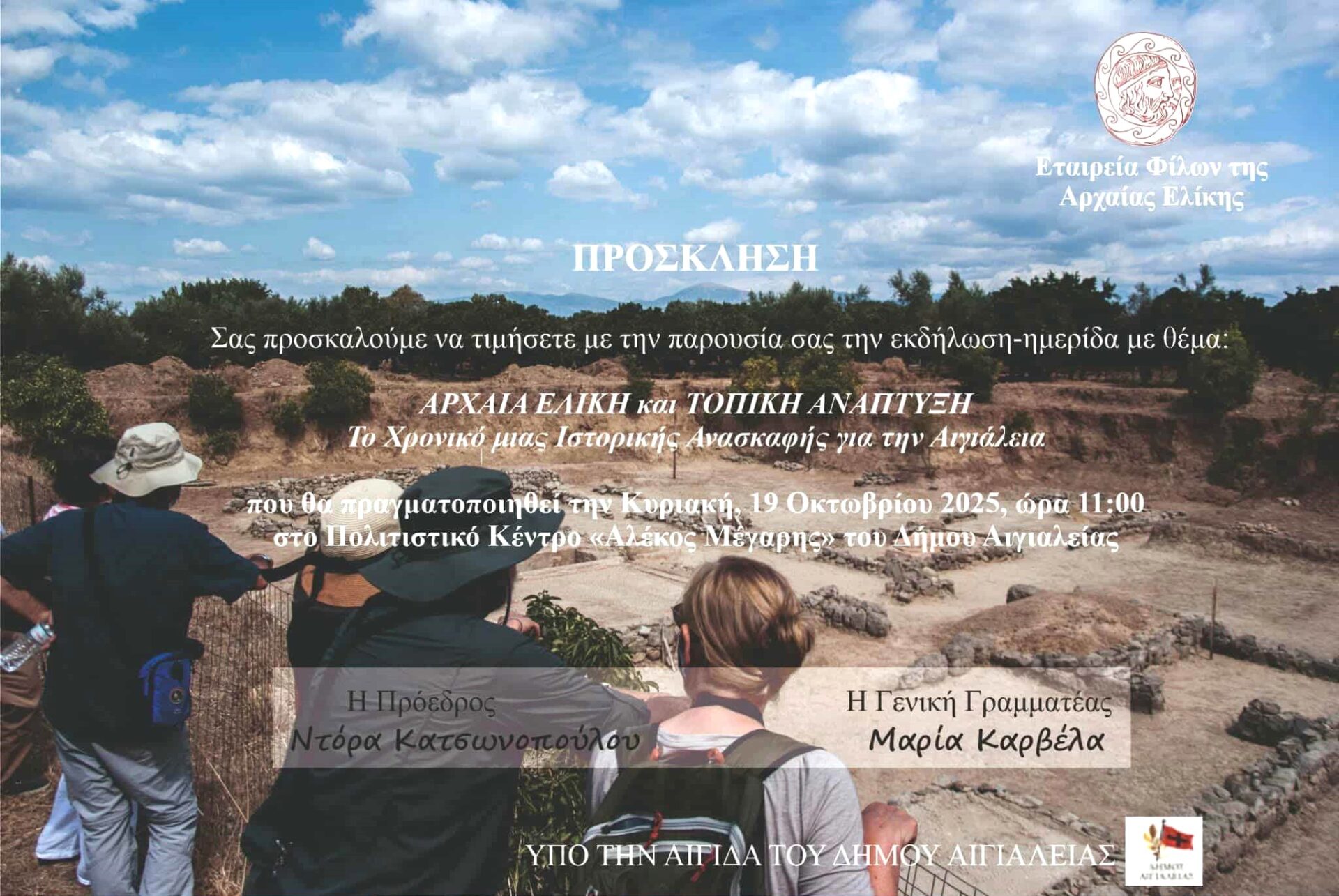Στο πλαίσιο των εκδηλώσεων της Εταιρείας Φίλων Αρχαίας Ελίκης για το έτος 2025, που ξεκίνησε τον Ιανουάριο 2025 με την παρουσίαση του νέου, 6ου κατά σειράν, τόμου Πρακτικών του ΣΤ’ Διεθνούς Συνεδρίου για την Αρχαία Ελίκη, και συνεχίστηκε με την προβολή των πρόσφατων ντοκυμαντέρ του αμερικανικού τηλεοπτικού καναλιού Discovery Channel και του βρετανικού Channel 5 για την ανακάλυψη της Αρχαίας Ελίκης, στο Αίγιο και στο Πανεπιστήμιο Πατρών, πραγματοποιείται την Κυριακή, 19 Οκτωβρίου 2025, ειδική εκδήλωση-ημερίδα στο Αίγιο για την Αρχαία Ελίκη και την Τοπική Ανάπτυξη.