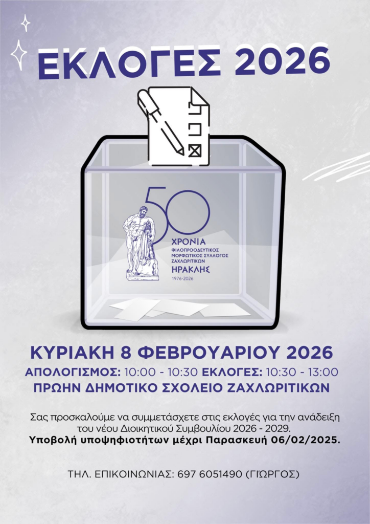 Την Κυριακή 8 Φεβρουαρίου 2026 ο Σύλλογος καλεί τα μέλη του να συμμετάσχουν στις εκλογές για την ανάδειξη του νέου Διοικητικού Συμβουλίου για την περίοδο 2026–2029.