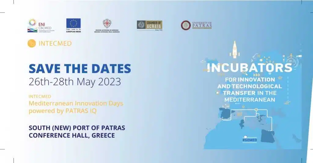 Τριήμερη εκδήλωση με θέμα «INTECMED Mediterranean Innovation Days» συνδιοργανώνεται από το Επιμελητήριο Αχαίας και το Πανεπιστήμιο Πατρών, με την υποστήριξη της PATRASIQ, την Παρασκευή 26/5-το Σάββατο 27/5 και την Κυριακή 29/5, στον Συνεδριακό χώρο του Νέου Λιμένα Πατρών (πρώην Mega Εμβολιαστικό Κέντρο). Η εκδήλωση διοργανώνεται στο πλαίσιο υλοποίησης του Ευρωπαϊκού έργου INTECMED-«Θερμοκοιτίδες για την αναζήτηση καινοτομίας και μεταφοράς τεχνογνωσίας στην περιοχή της Μεσογείου»(Πρόγραμμα Χρηματοδότησης ENICBCMED 2014-2020)στο οποίο το Επιμελητήριο Αχαίας είναι ο Επικεφαλής εταίρος ενώ το Πανεπιστήμιο Πατρών συμμετέχει ως εταίρος στην σύμπραξη.
