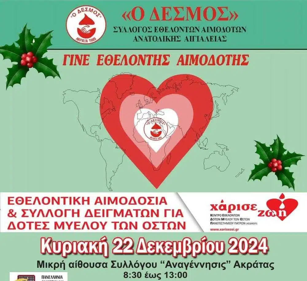 Ο Σύλλογος Εθελοντών Αιμοδοτών Ανατολικής Αιγιαλείας «Ο ΔΕΣΜΟΣ» διοργανώνει εθελοντική αιμοδοσία, την Κυριακή 22 Δεκεμβρίου και ώρες 8.30 π.μ. – 1.00 μ.μ. στο Παλαιό Κτίριο (μικρή αίθουσα) του Πολιτιστικού Συλλόγου «Αναγέννησις» Ακράτας.