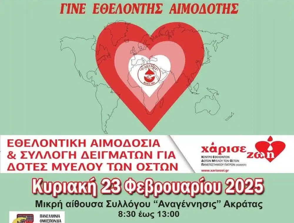 Ο Σύλλογος Εθελοντών Αιμοδοτών Ανατολικής Αιγιαλείας «Ο ΔΕΣΜΟΣ» διοργανώνει εθελοντική αιμοδοσία, την Κυριακή 23 Φεβρουαρίου και ώρες 8.30 π.μ. – 1.00 μ.μ. στο Παλαιό Κτίριο (μικρή αίθουσα) του Πολιτιστικού Συλλόγου «Αναγέννησις» Ακράτας.