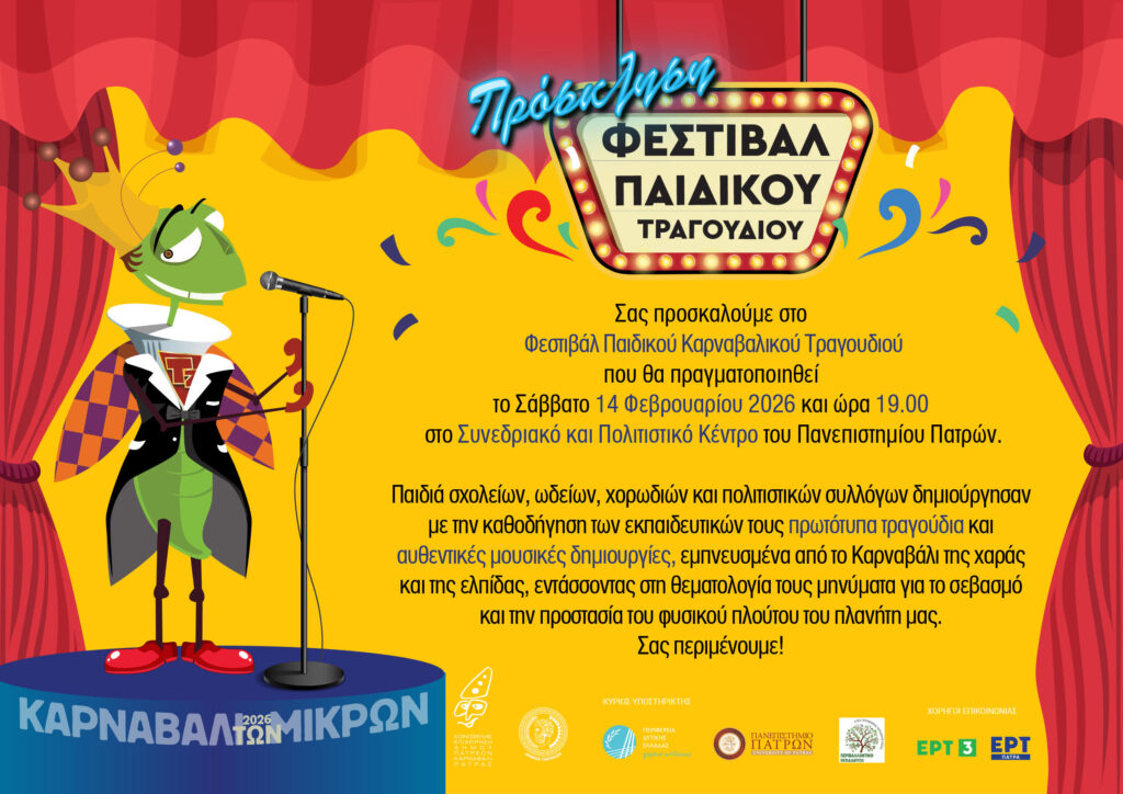 Αυτά τα πρωτότυπα τραγούδια και αυτές τις αυθεντικές μουσικές δημιουργίες μέσα από αιθέριες παιδικές φωνές θα πλημμυρίσουν το Σάββατο 14 Φεβρουαρίου στις 19.00 τη μεγάλη αίθουσα του Συνεδριακού και Πολιτιστικού Κέντρου του Πανεπιστημίου Πατρών όπου θα πραγματοποιηθεί το Φεστιβάλ Παιδικού Τραγουδιού 2026.