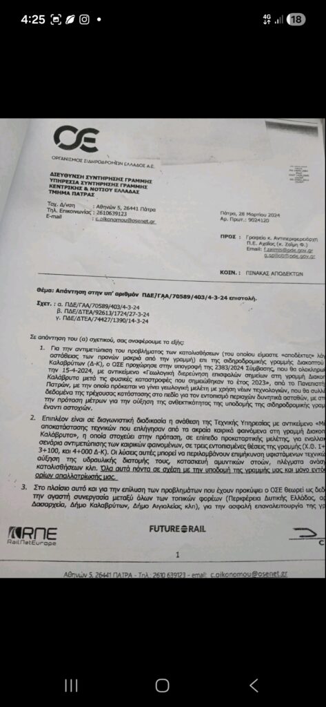 Το έγγραφο του ΟΣΕ με ημερομηνία 28 Μαρτίου 2024, το οποίο εκδόθηκε ως απάντηση σε αναφορά και κοινοποιήθηκε σε σειρά υπουργείων, είναι απολύτως αποκαλυπτικό για την κατάσταση στη γραμμή Διακοπτού – Καλαβρύτων. Στο κείμενο αναφέρεται ρητά ότι ο Οργανισμός είχε προχωρήσει σε σύμβαση για γεωλογική διερεύνηση των σημείων επιρροής, με στόχο την πρόταση μέτρων για την αύξηση της ανθεκτικότητας της υποδομής. Μάλιστα, η ολοκλήρωση της έρευνας προβλεπόταν εντός του Απριλίου 2024, με το έγγραφο να προειδοποιεί ξεκάθαρα: «Από τον χρόνο και την ταχύτητα εκκίνησης των έργων εξαρτάται η μη επανάληψη διακοπής λειτουργίας της γραμμής στο άμεσο μέλλον».