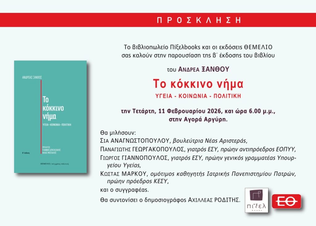 Στο επίκεντρο μιας κρίσιμης συζήτησης για τη δημόσια υγεία, την κοινωνία και την πολιτική θα βρεθεί η Πάτρα την Τετάρτη 11 Φεβρουαρίου 2026, με αφορμή την παρουσίαση της δεύτερης έκδοσης του βιβλίου του πρώην υπουργού Υγείας επί κυβέρνησης ΣΥΡΙΖΑ, Ανδρέα Ξανθού, “Το κόκκινο νήμα”.