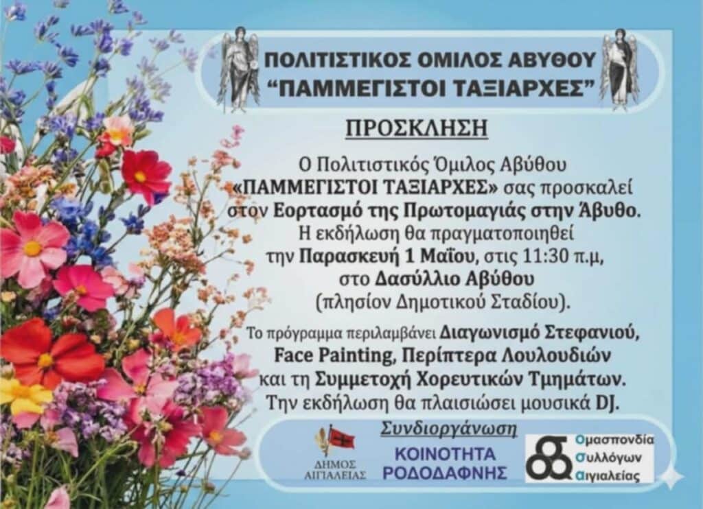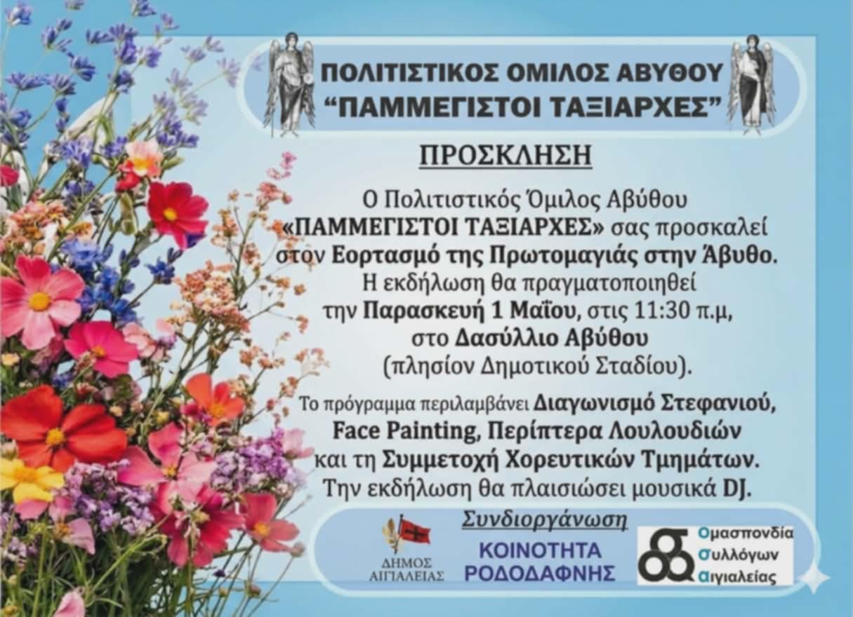 Με αφορμή την Πρωτομαγιά, ο Πολιτιστικός Όμιλος Αβύθου «ΠΑΜΜΕΓΙΣΤΟΙ ΤΑΞΙΑΡΧΕΣ» διοργανώνει μια ξεχωριστή γιορτή, προσκαλώντας μικρούς και μεγάλους να συμμετάσχουν σε μια ημέρα γεμάτη χρώματα, μουσική και παράδοση.