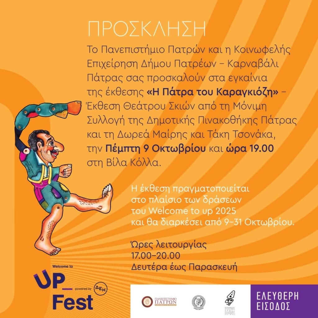 Παράλληλα στις εγκαταστάσεις του Πανεπιστημίου στο Κουκούλι, στη «Βίλα Κόλλα» την Πέμπτη 9 Οκτωβρίου και ώρα 19.00 θα εγκαινιαστεί η Έκθεση Θεάτρου Σκιών «Η Πάτρα του Καραγκιόζη» με αντικείμενα και φιγούρες από τη μόνιμη συλλογή της Δημοτικής Πινακοθήκης Πατρών και τη δωρεά της Μαίρης και του Τάκη Τσονάκα. Μια έκθεση εστιασμένη στη σχέση του Θεάτρου Σκιών με την Πάτρα, αφού από την πόλη μας ξεκίνησαν οι προσπάθειες εξελληνισμού του Καραγκιόζη. Τα εγκαίνια θα πλαισιώσει παραδοσιακή παράσταση θεάτρου σκιών από τον Κώστα Μακρή. Στο πλαίσιο της παράστασης θα μιλήσει ο ερευνητής-ιστορικός του θεάτρου σκιών και συγγραφέας Άρης Μηλιώνης.