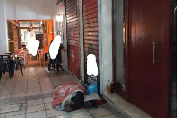 Μια τέτοια περίπτωση είναι αυτή του αστέγου στις φωτογραφίες που τελευταία κοιμάται στο πάνω μέρος της οδού Πατρέως, έξω από την είσοδο μιας πολυκατοικίας που υπάρχει εκεί.