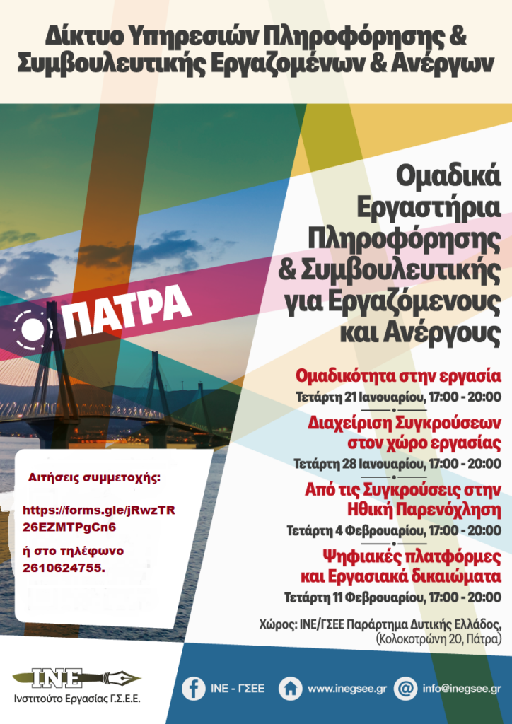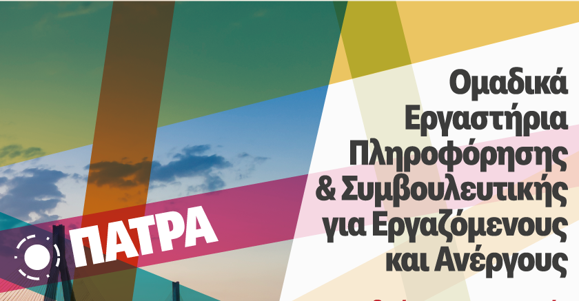 Το Ινστιτούτο Εργασίας ΓΣΕΕ (ΙΝΕ/ΓΣΕΕ) Περιφέρειας Δυτικής Ελλάδαςδιοργανώνει σε νέες θεματικές ενότητες διά ζώσης ομαδικά εργαστήρια Συμβουλευτικήςστην Πάτρα,στο πλαίσιο λειτουργίας του Δικτύου Υπηρεσιών Πληροφόρησης & Συμβουλευτικής Εργαζομένων & Ανέργων.