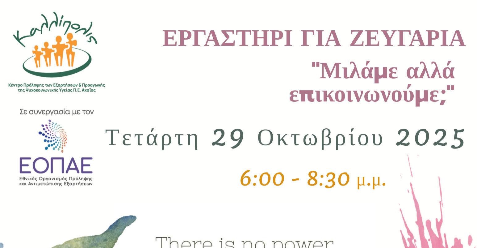 Το Κέντρο Πρόληψης των Εξαρτήσεων & Προαγωγής της Ψυχοκοινωνικής Υγείας Π.Ε. Αχαΐας «Καλλίπολις» που λειτουργεί σε συνεργασία με τον Εθνικό Οργανισμό Πρόληψης & Αντιμετώπισης Εξαρτήσεων (Ε.Ο.Π.Α.Ε.) πρόκειται να υλοποιήσει εργαστήρι για ζευγάρια στο Αίγιο την Τετάρτη 29 Οκτωβρίου 2025 και ώρες 18:00-20:30.