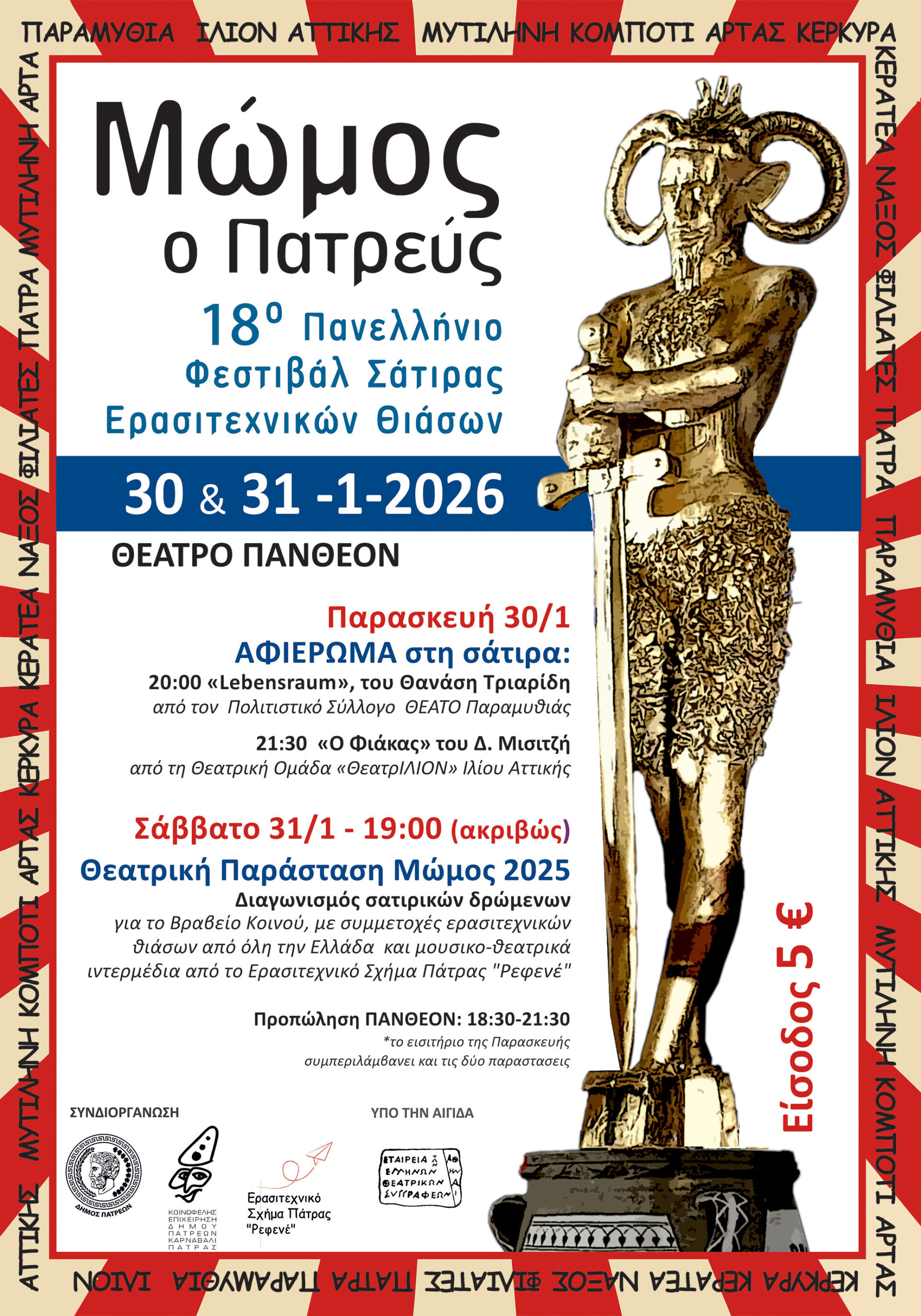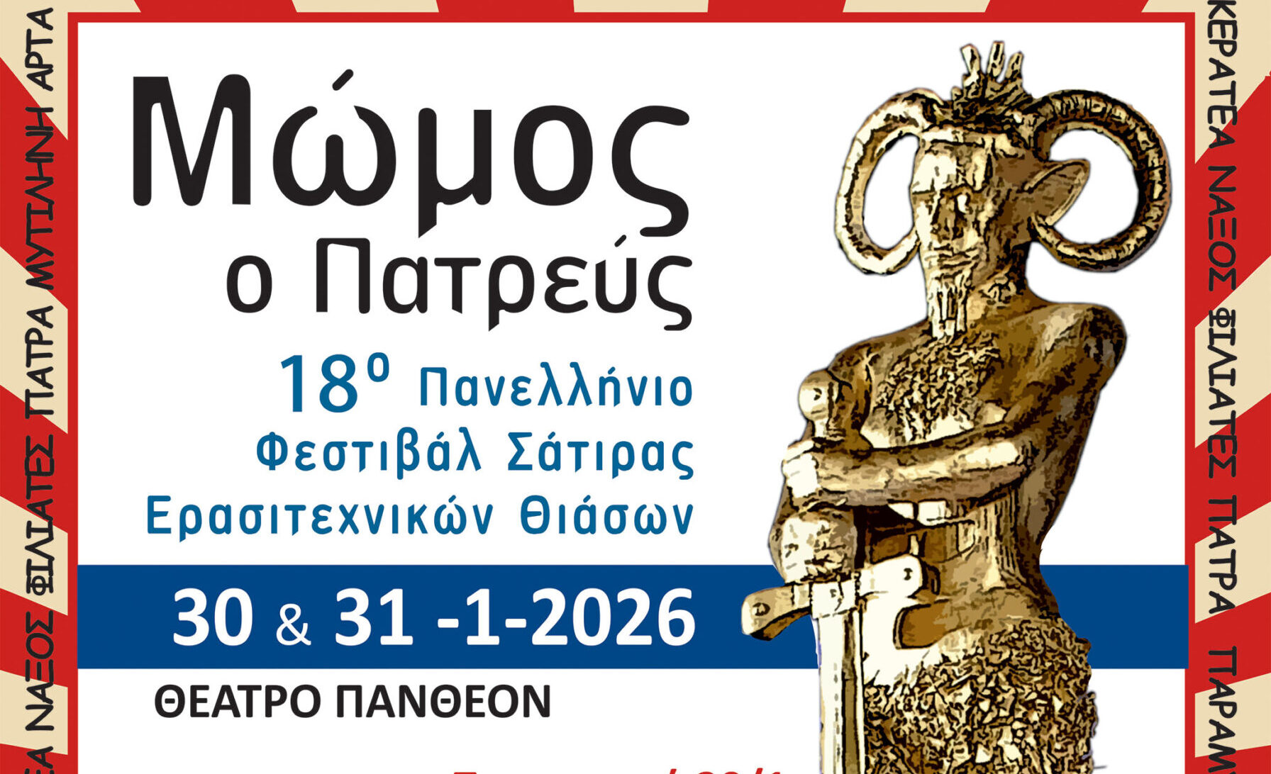 Ο 18ος Μώμος ο Πατρεύς, το Πανελλήνιο Φεστιβάλ Σάτιρας Ερασιτεχνικών Θιάσων, ανοίγει τις πύλες του την Παρασκευή στο Πάνθεον. Όπως κάθε χρόνο 11 ομάδες από ολόκληρη τη χώρα συνεργάζονται και συνθέτουν ένα διήμερο σατιρικών δρώμενων, στο πλαίσιο του Πατρινού Καρναβαλιού. Τον γέλωτα σκοπεύουν, ιοβόλο και λυτρωτή.