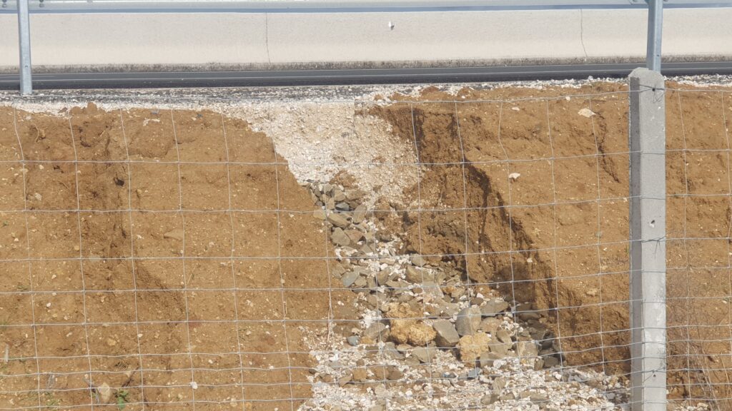 Καθηγητές με εμπειρία στον τομέα της γεωτεχνικής μηχανικής ενημερώνουν ότι υπάρχει κατάρρευση πρανούς, η οποία είναι βέβαιο ότι θα οδηγήσει σε καθίζηση εδάφους στα δεξιά του οδοστρώματος, εκεί όπου κινούνται καθημερινά βαρέα φορτηγά.