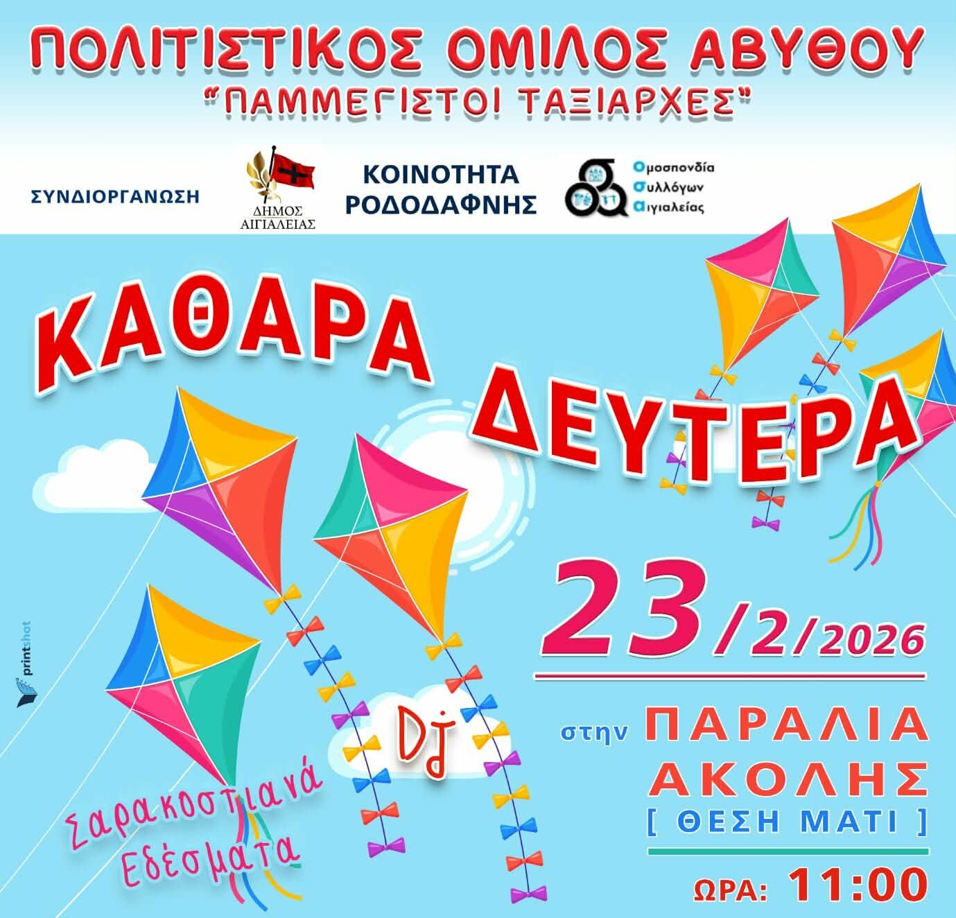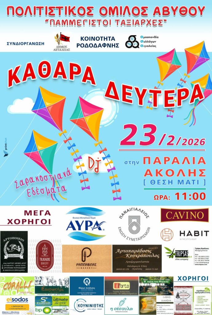 Ο Πολιτιστικός Όμιλος Αβύθου «Παμμέγιστοι Ταξιάρχες», διοργανώνει μια γιορτινή εκδήλωση για τον εορτασμό της Καθαράς Δευτέρας, τη Δευτέρα 23 Φεβρουαρίου 2026, στην Παραλία Ακόλης (Θέση Μάτι).