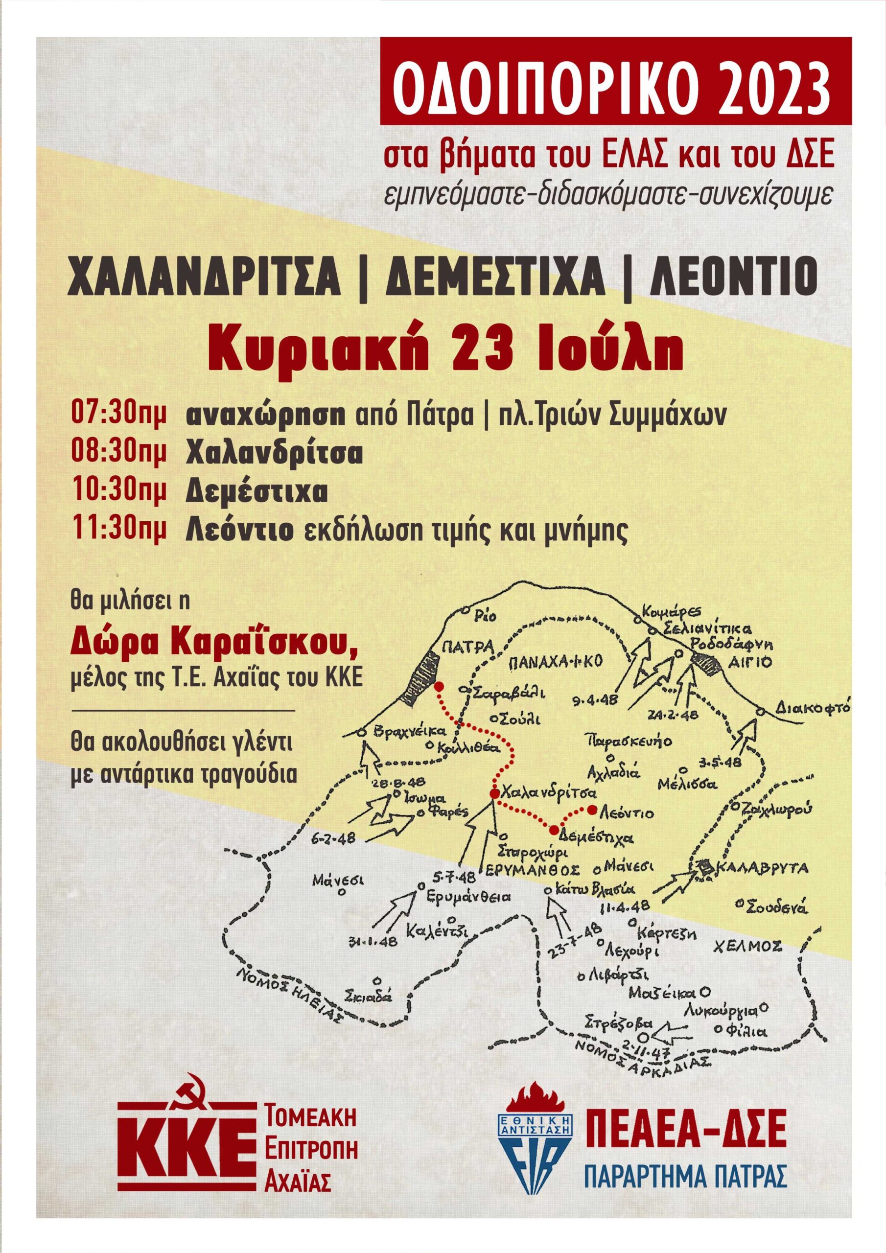Οδοιπορικό στα βήματα του ΕΛΑΣ και του ΔΣΕ στη Χαλανδρίτσα, τα Δεμέστιχα και το Λεόντιο θα πραγματοποιήσουν την Κυριακή 23 Ιούλη, η Τομεακή Επιτροπή Αχαΐας του ΚΚΕ και το Παράρτημα Πάτρας της ΠΕΑΕΑ – ΔΣΕ. Στο οδοιπορικό θα συμμετέχει και το Παράρτημα Αιγιάλειας της ΠΕΑΕΑ-ΔΣΕ.
