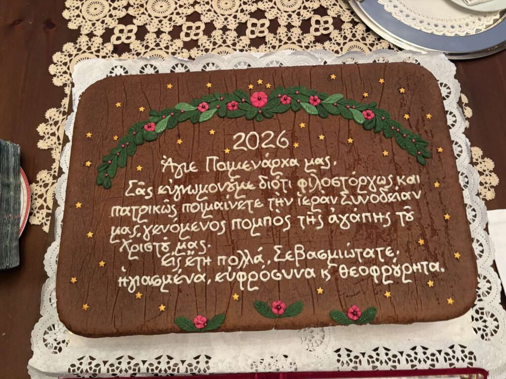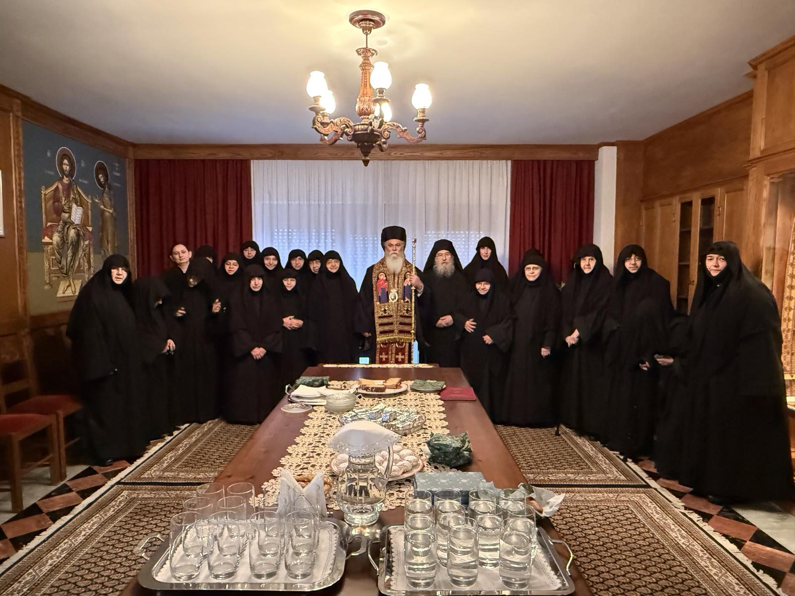 Η Οσιωτάτη Ηγουμένη και οι Μοναχές της Αδελφότητος αντευχήθηκαν προς τον Σεβασμιώτατο, εκφράζοντας με βαθύ σεβασμό και αγάπη την ευγνωμοσύνη τους για τη διαρκή ποιμαντική του φροντίδα, την πατρική του στοργή και την αμέριστη συμπαράστασή του στο πνευματικό τους έργο, δεόμενες υπέρ μακροημερεύσεως και καρποφόρου εξακολουθήσεως της θεοφρουρήτου ποιμαντορίας του Σεβασμιωτάτου Μητροπολίτου μας κ. Ιερωνύμου.