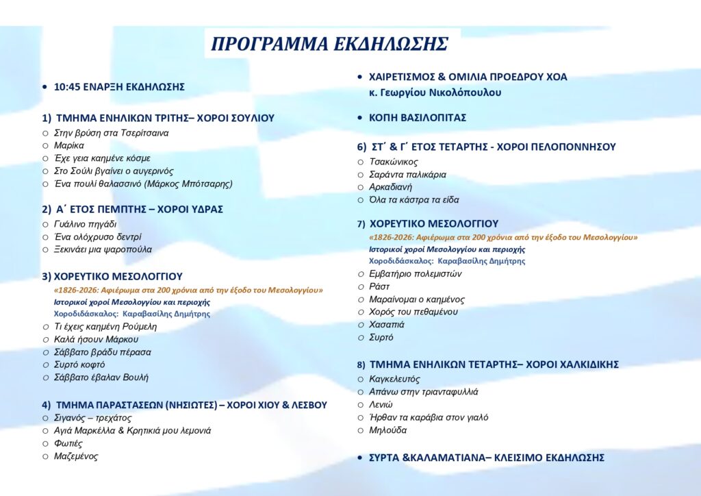 Η φετινή εκδήλωση είναι αφιερωμένη στα 200 χρόνια από την Έξοδο του Μεσολογγίου και περιλαμβάνει θεματικό χορευτικό πρόγραμμα, εμπνευσμένο από τα ιστορικά γεγονότα και την ηρωική αντίσταση των Ελεύθερων Πολιορκημένων.