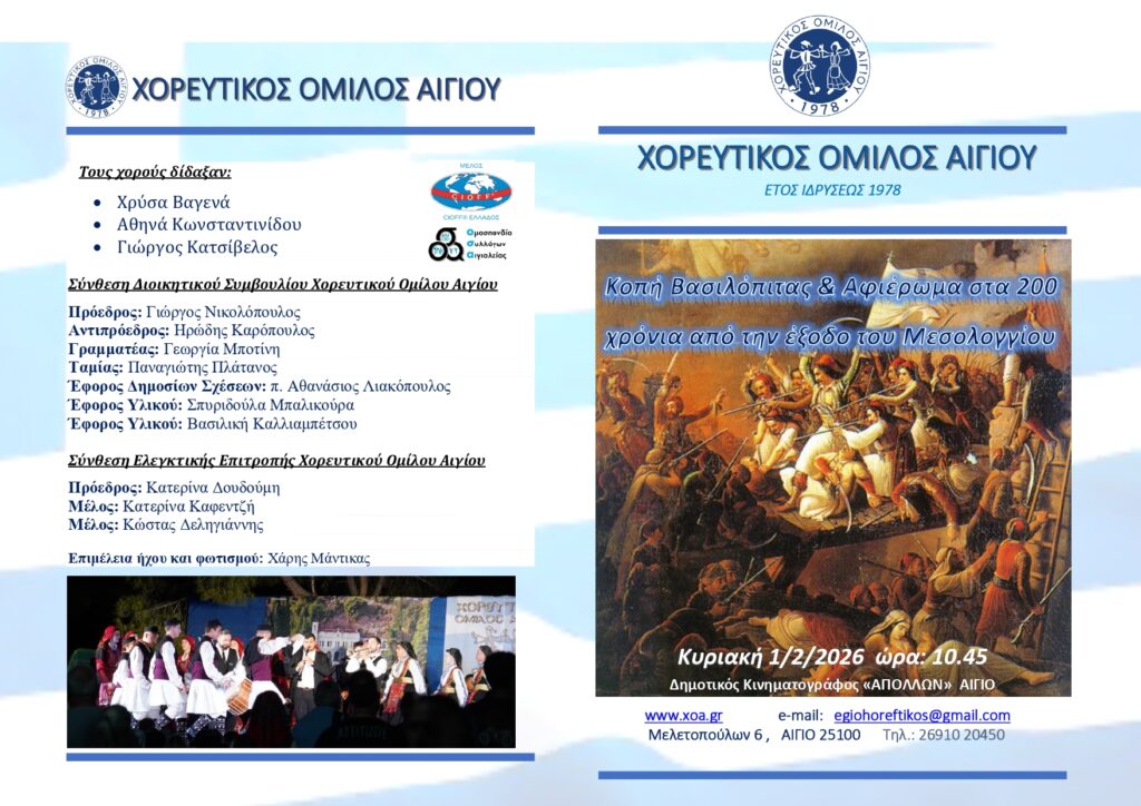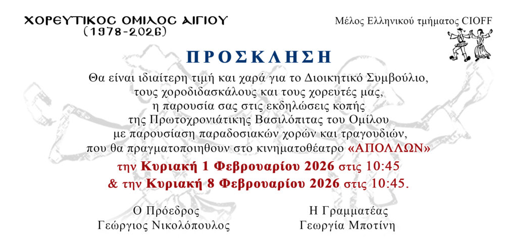 Ο Χορευτικός Όμιλος Αιγίου διοργανώνει την καθιερωμένη κοπή της Βασιλόπιτας την Κυριακή 1 Φεβρουαρίου 2026 και ώρα 10:45, καθώς και την Κυριακή 8 Φεβρουαρίου 2026 και ώρα 10:45, στον Δημοτικό Κινηματογράφο «Απόλλων».