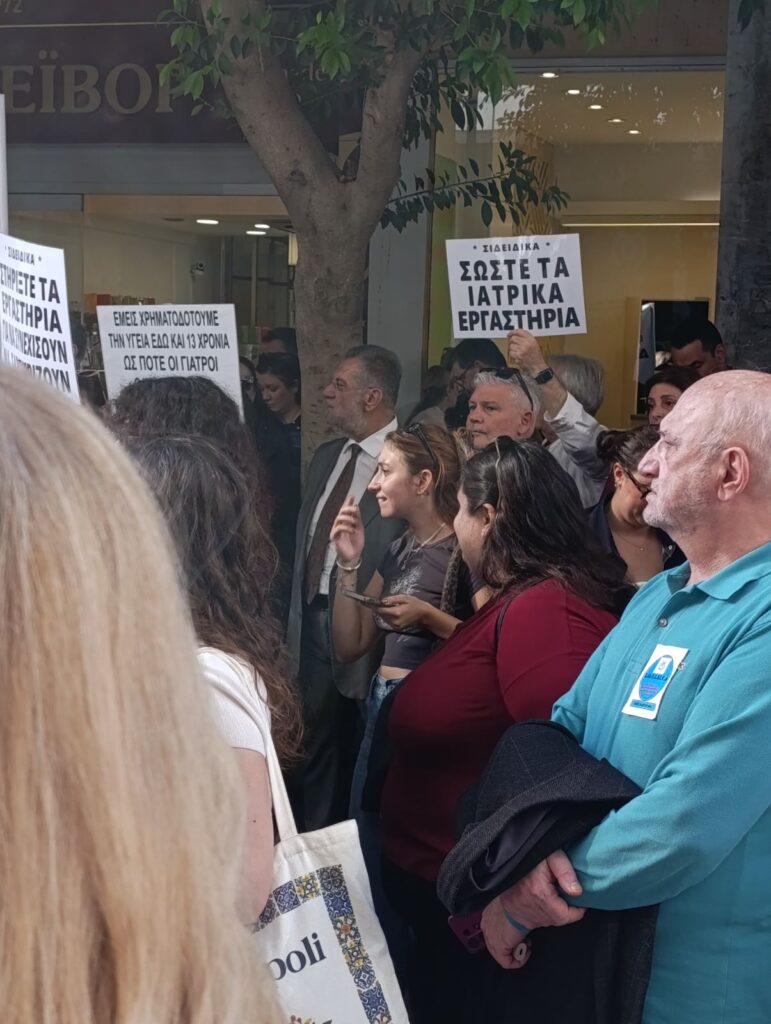 Στη συνέχεια συμμετείχε στη διαμαρτυρία της Πανελλήνιας Ομοσπονδίας Εργαστηριακών Ιατρών (Π.Ο.ΕΡΓ.Ι.) έξω από το Υπουργείο Οικονομικών, όπου συνομίλησε με τους γιατρούς και εξέφρασε την αλληλεγγύη του στον αγώνα τους, ενώ υπενθύμισε ότι ο ΣΥΡΙΖΑ-ΠΣ έχει καταθέσει επανειλημμένα τροπολογία για το θέμα του clawback.