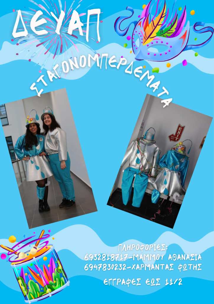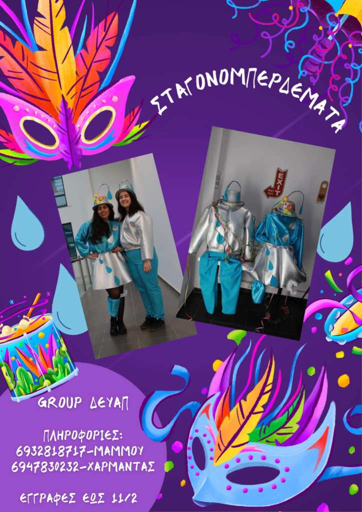 Τα «σταγονομπερδέματα» είναι… έτοιμα και αναμένεται να εντυπωσιάσουν! Ήδη οι στολές κερδίζουν τα βλέμματα και όλοι όσοι θέλουν να συμμετέχουν στο γκρουπ των εργαζομένων της ΔΕΥΑΠ μπορούν να εγγραφούν ως την Τετάρτη 11 Φεβρουαρίου.