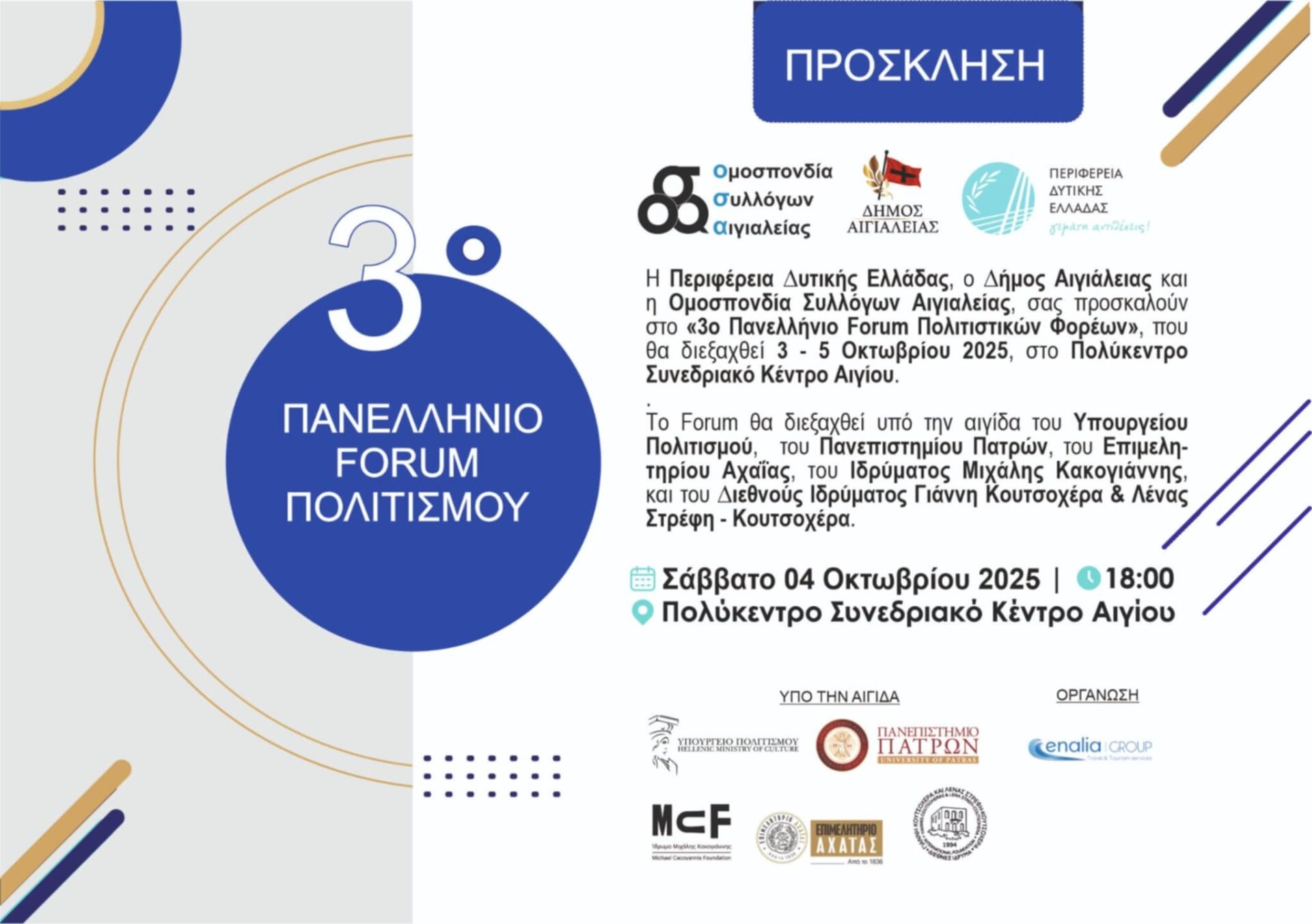 Η Περιφέρεια Δυτικής Ελλάδας, ο Δήμος Αιγιαλείας και η Ομοσπονδία Συλλόγων Αιγιαλείας, διοργανώνουν την κεντρική εκδήλωση του «3ου ΠανελλήνιουForum Πολιτιστικών Φορέων», που θα πραγματοποιηθεί το Σάββατο, 4 Οκτωβρίου 2025 και ώρα 18:30, στο Πολύκεντρο Συνεδριακό Κέντρο Αιγίου.
