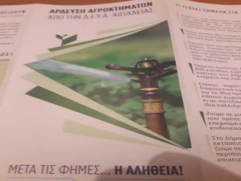Θα το θυμάστε το φυλλαδιάκι που είχε κυκλοφορήσει η ΔΕΥΑ από σπίτι σε σπίτι. Οι αλήθειες και τα ψέματα για το τιμολόγιο άρδευσης. Οι 40.000 κάτοικοι του Δήμου που δεν ποτίζουν δεν είναι δίκαιο να πληρώνουν το κόστος για όσους ποτίζουν. Βασική παράμετρος για να δημιουργήσουμε ένα δίκαιο σύστημα είναι να δηλώσουμε τις εκτάσεις που καλλιεργούμε και μόνο αν είναι όλοι ειλικρινείς και δηλώσουν τις εκτάσεις που ποτίζουν θα μειωθεί το τιμολόγιο. Τότε που κυκλοφόρησε αυτό το φυλλάδιο, ο Δήμος πλήρωνε πάνω από 1 εκατομμύριο τον χρόνο ενώ τα έσοδα από την άρδευση ήταν λιγότερα από 200.000.Τώρα που η αλήθεια έγινε χάος του covid και ουδείς ξέρει τι του ξημερώνει, αυτό το φυλλάδιο έχει ακόμη μεγαλύτερη αξία για να φτάσουμε κάποια στιγμή σε ένα δίκαιο σύστημα και με χαμηλό τιμολόγιο άρδευσης σε όλες τις κοινότητες και τους οικισμούς.