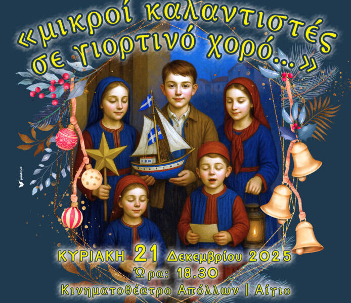 Με κάλαντα και χορούς θα υποδεχτούν τις γιορτές οι μικροί χορευτές-χορεύτριες του Χοροστασίου. Η θεματική παράσταση «μικροί καλαντιστές σε γιορτινό χορό» θα γίνει σήμερα Κυριακή, στις 6.30 το απόγευμα, στο κινηματοθέατρο Απόλλων στο Αίγιο.
